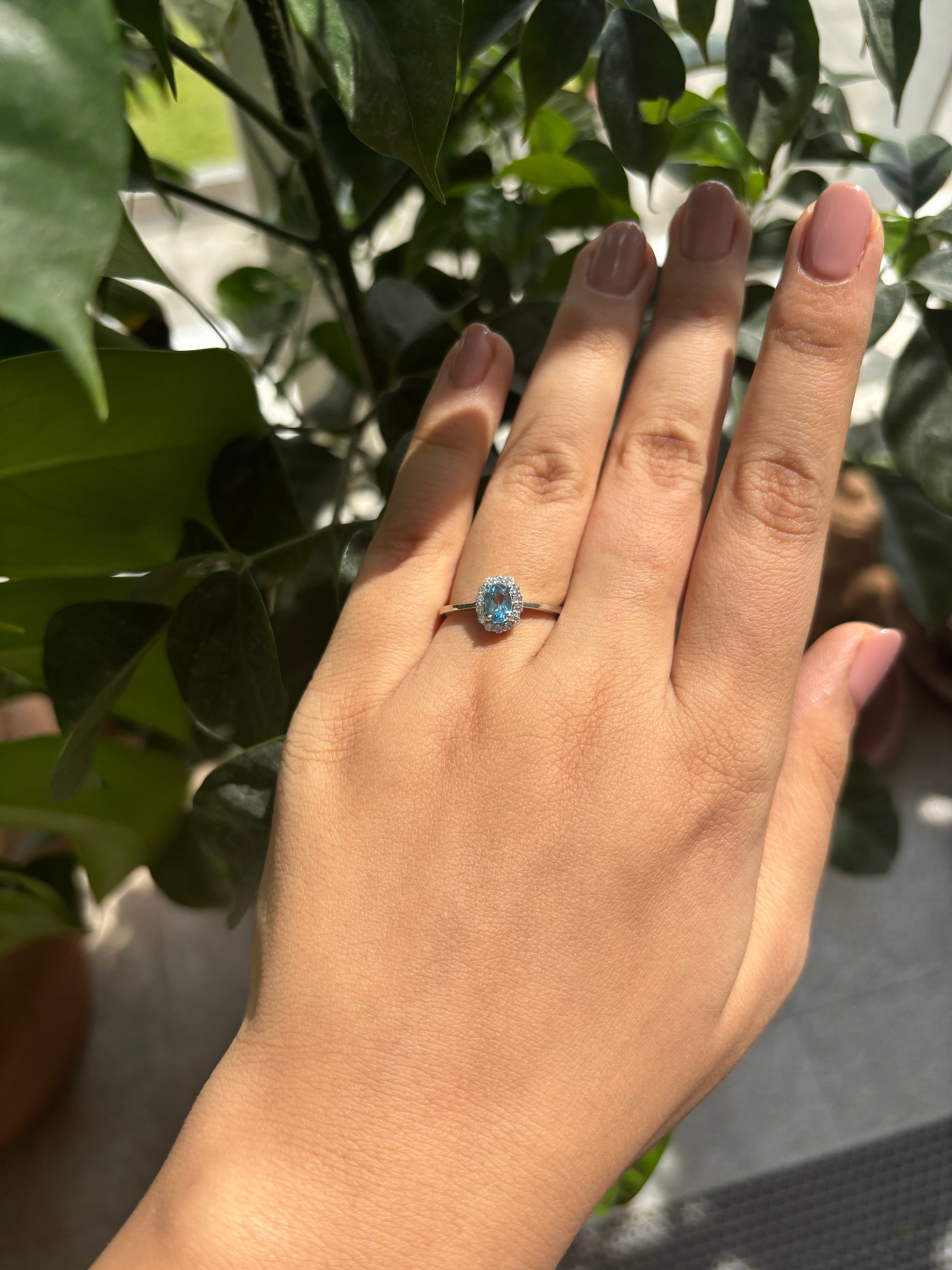 The Aqua Halo Ring features a brilliant oval-cut blue topaz, framed by a sparkling halo of crystal accents. Crafted in 925 sterling silver, this timeless design adds a touch of elegance and color to your everyday look or special occasions.